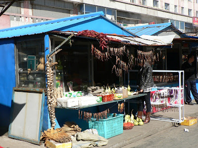 I suppose some explanation for the hanging frogs would be useful. The region around Dunhua is famous for Chinese Forest Frogs. The females are especially prized for their oil, particularly the oil in the oviducts, for a variety of medicines and food (see here, here, and here for more fascinating details and photos). They are hung to dry to help extract the oil and other goodies.